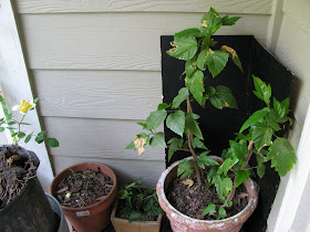 MORE HIBISCUS, the two on the left are the from the pruned hibiscus plant. The one on the Right is the mother Hibiscus. She was passed down from my mother. I've had this plant for 5 years now after my mother having it for alteast 10yrs. Its been thru alot.
